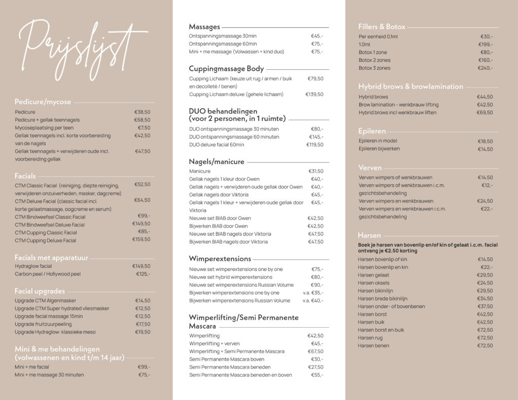 Ga naar onze Online Reserveren pagina voor het boeken van je afspraak en de prijzen.